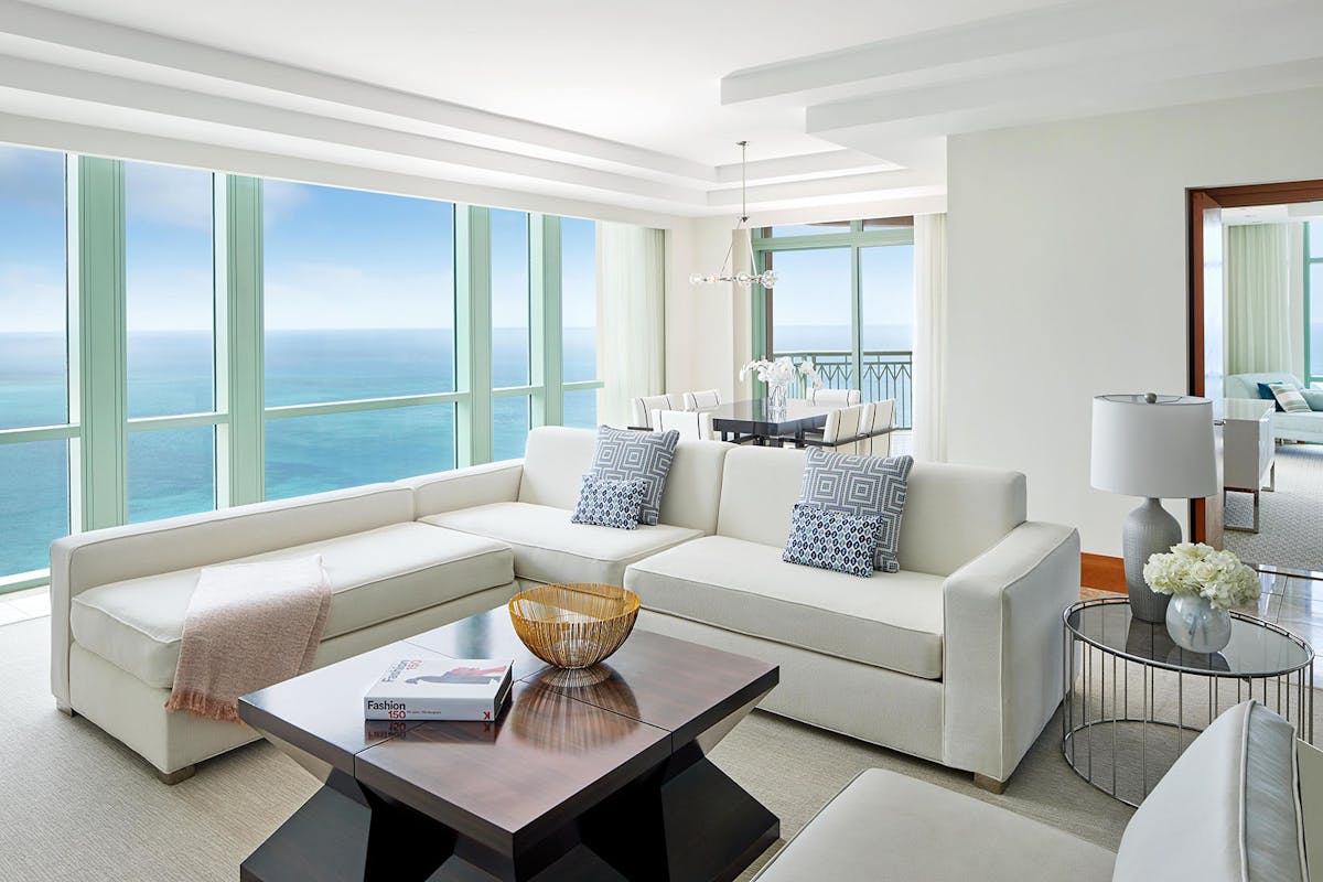 Located on floors 1-14, this 1-bedroom club-level suite boasts 1,700 sq. ft. of pure luxury with dedicated butler service. The Sapphire Suite offers an expansive guest living space adorned with exquisite details ranging from delicate opaline glass lighting fixtures to original hand-painted abstract artwork. Primary bedroom features a King Bed, separate dining and living areas, and a spacious main bathroom with Brescia marble floors and Italian-designed Catalano sinks and Waterworks soaking tub.