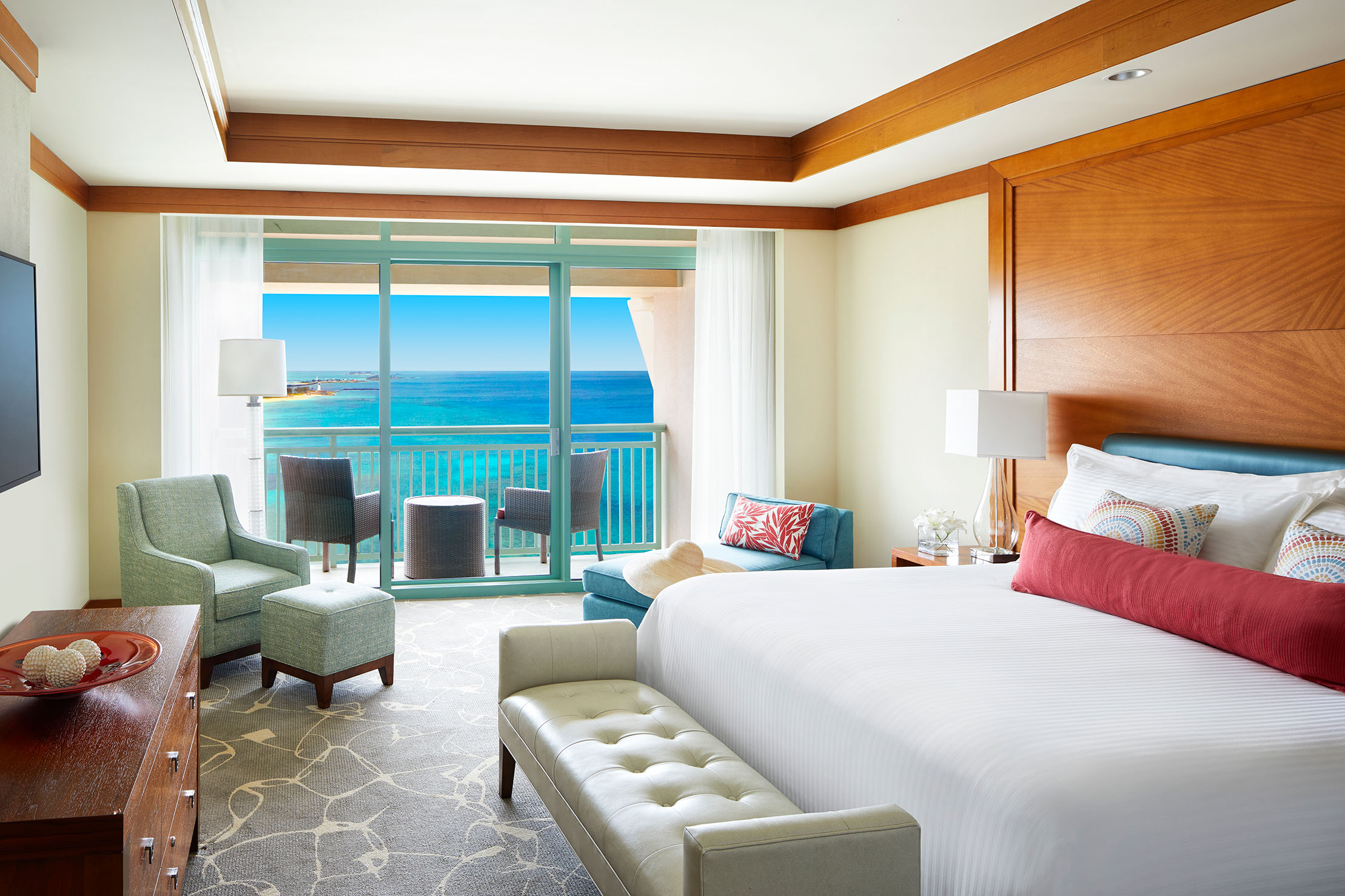 With an open floor plan, this 672 - 784 sq. ft. suite delivers a luxury guest experience. Relax in your step-down living area or on the balcony overlooking the crystal blue ocean. The suite offers 1 King Bed or 2 Queen Beds, a sleeper sofa, walk-in closet and bathroom with twin vanities, soaking tub and separate shower.