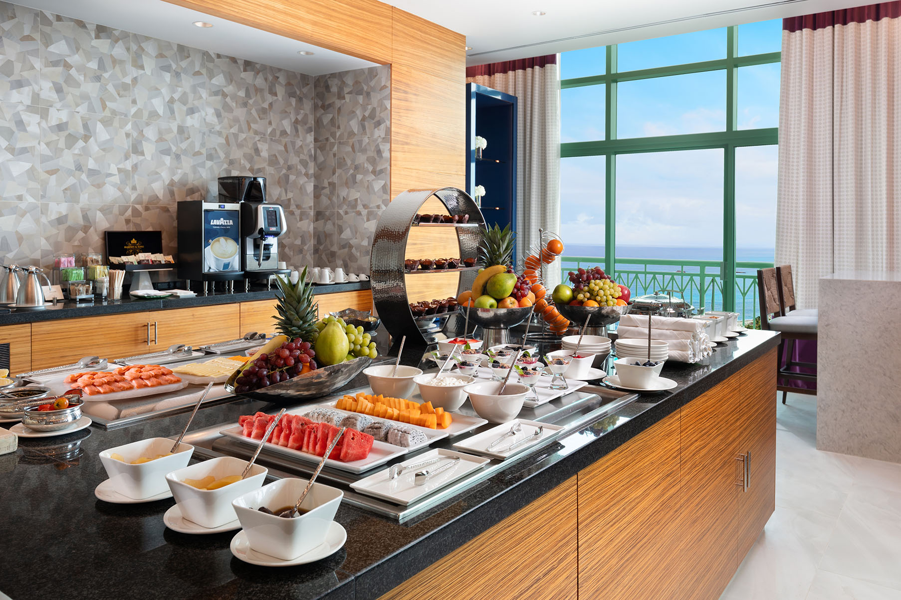 Culinary presentations are served daily in the Lapis Club Lounge on the 22nd floor of the Coral Tower.